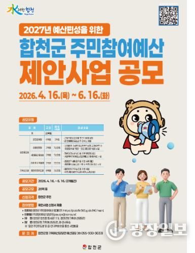 광장일보 주재영 기자 | 합천군은 2027년도 예산편성을 위한 주민참여예산 제안사업 공모를 6월 16일까지 실시하며, 올해부터 공모 분야를 기존 1개 모델 3개 유형에서 3개 모델 5개 유형으로 확대 개편한다고 밝혔다.
