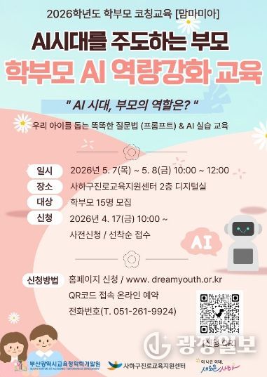 광장일보 주재영 기자 | 사하구진로교육지원센터는 오는 5월 7일부터 5월 8일까지 양일간 학부모를 대상으로 'AI 시대, 부모의 역할은?' 특강을 운영한다.