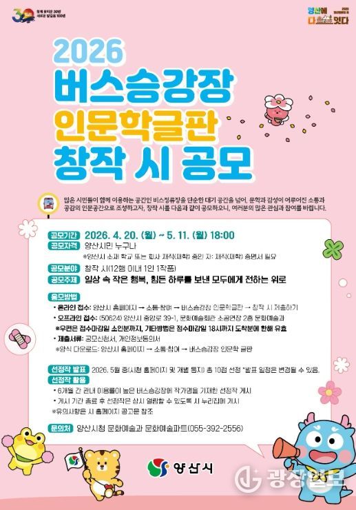광장일보 주재영 기자 | 양산시는 시민들의 일상 공간인 버스승강장을 문학적 감성이 흐르는 인문 공간으로 조성하기 위해 ‘2026 버스승강장 인문학글판 창작시 공모’를 추진한다.