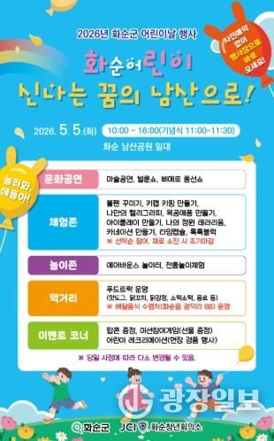 군은 오는 5월 5일 남산공원 일원에서 ‘화순 어린이 신나는 꿈의 남산으로’를 부제로 한 ‘2026년 화순군 어린이날 행사’를 개최한다.