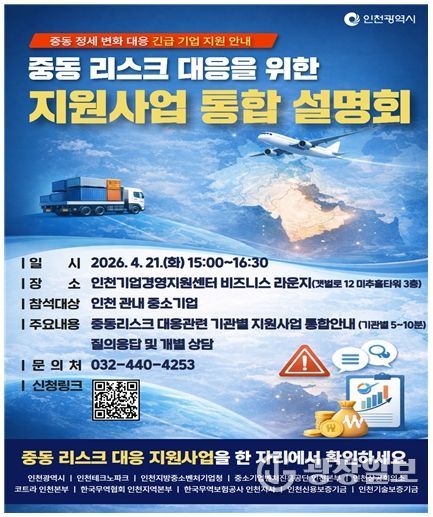 인천시는 중동 지역 지정학적 리스크 확대에 대응해 ‘중동 리스크 대응 지원사업 통합 설명회’를 개최한다고 밝혔다.