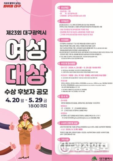 광장일보 주재영 기자 | 대구광역시는 여성의 지위 향상과 양성평등 실현에 공헌한 여성 인재를 발굴·격려하기 위해 ‘2026년 제23회 대구광역시 여성대상’ 수상 후보자를 4월 20일부터 5월 29일까지 공개 모집한다.
