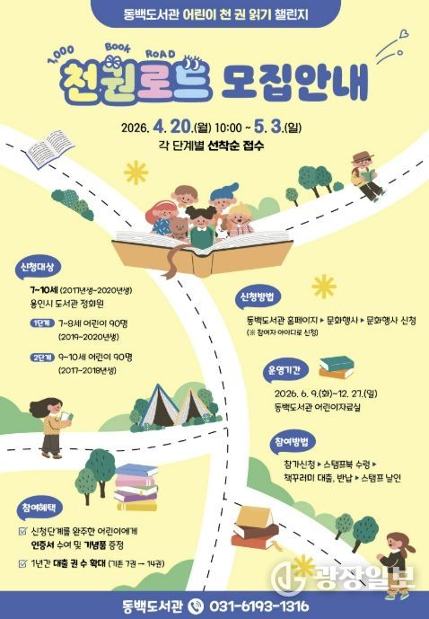 광장일보 주재영 기자 | 용인특례시 동백도서관은 어린이 천 권 읽기 챌린지 ‘천권로드(ROAD)’ 참여자를 모집한다고 20일 밝혔다.