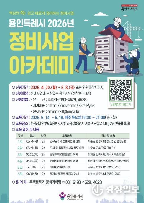 광장일보 주재영 기자 | 용인특례시는 4월 20일부터 5월 8일까지 ‘2026년 정비사업 아카데미’ 수강생을 모집한다.