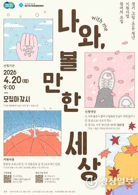 광장일보 박균현 기자 | 경기도가 사회적 관계가 단절된 고립·은둔 청년의 일상 회복을 돕기 위해 20일부터 ‘경기 고립·은둔 청년 지원사업: 나와(with me), 볼만한 세상’ 참여자 300명을 모집한다.