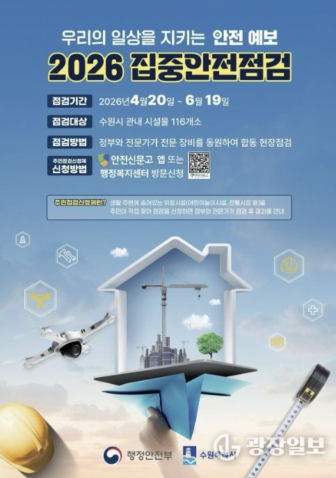 광장일보 박균현 기자 | 수원특례시가 안전사고를 예방하고, 시민의 안전 의식을 고취하기 위해 20일부터 6월 19일까지 ‘2026년 집중안전점검’을 한다.