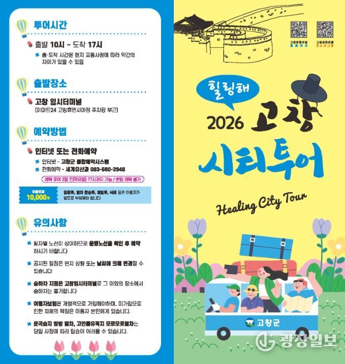 한편, '힐링해' 고창 시티투어버스는 사전 예약제로 운영되며, 고창군 홈페이지 통합예약시스템 및 전화 예약을 통해 예약할 수 있다.