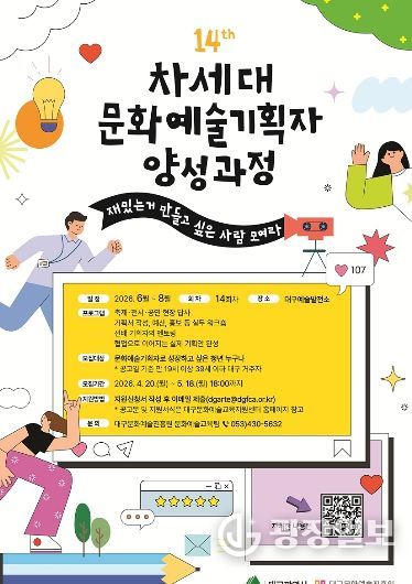 광장일보 주재영 기자 | 대구문화예술진흥원 문화예술본부는 대구 지역 자원을 기반으로 문화예술 생태계를 이끌어갈 인재를 양성하기 위한 ‘2026 차세대 문화예술기획자 양성 과정’ 교육생을 모집한다.