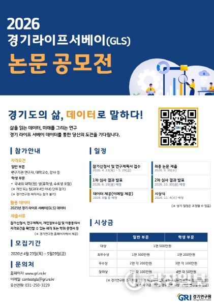경기연구원은 이번 조사를 통해 확보한 대규모 데이터를 기반으로 데이터 중심의 과학적 행정을 뒷받침하고, 증거 기반 연구 역량을 한층 강화하는 데 주력할 방침이다. 연구 데이터의 지속가능성을 확보하고 창의적인 분석 아이디어를 통해 정책 활용도를 높이기 위해 ‘2026년 경기 라이프 서베이(GLS) 논문 공모전’을 개최할 예정이며, 이를 통해 도출된 제안과 분석 결과를 실질적인 정책 근거자료로 활용할 계획이다.