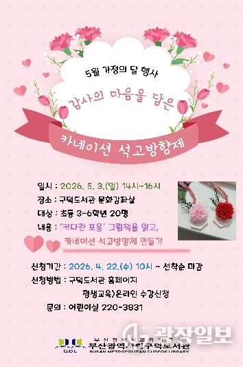 광장일보 주재영 기자 | 부산광역시립구덕도서관은 다음달 3일 도서관 문화강좌실에서 초등학교 3~6학년 20명을 대상으로 ‘감사의 마음을 담은 카네이션 석고방향제’ 체험을 운영한다.