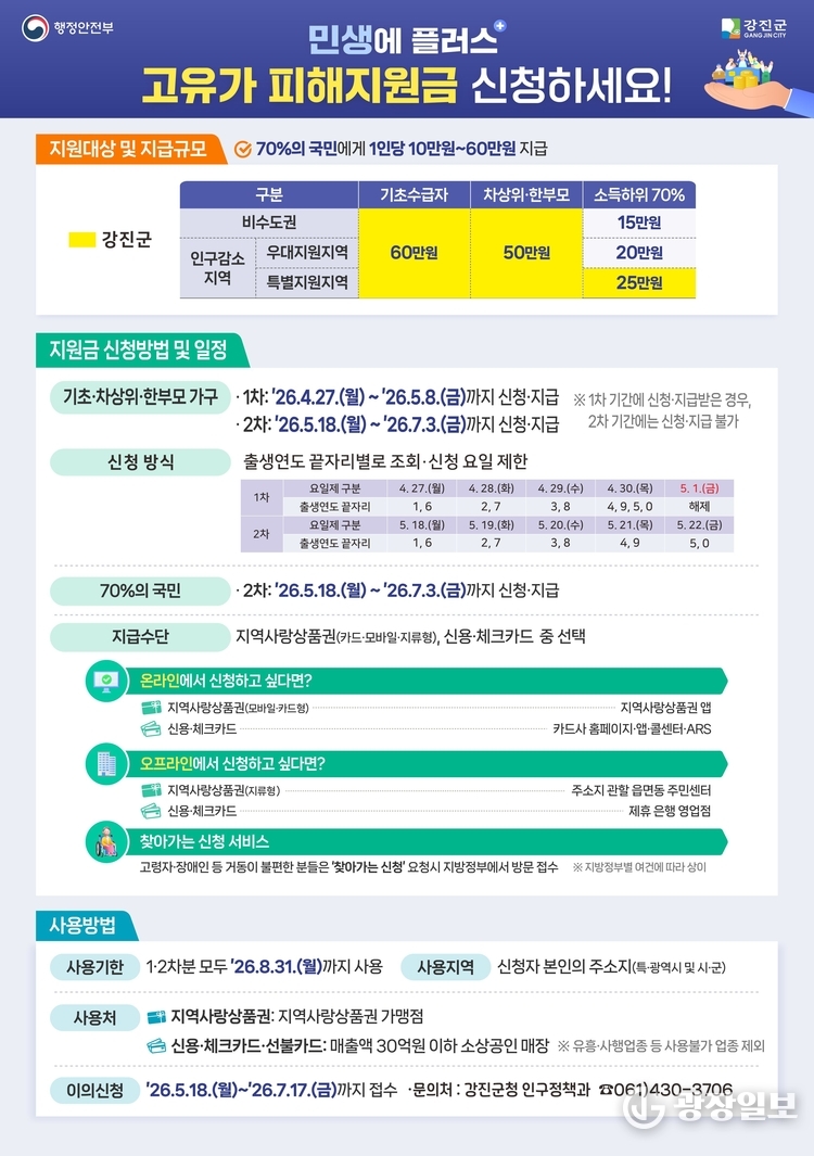 이와 함께 지급 방식은 신용·체크카드 및 모바일 상품권 신청 시 다음 날 충전되며, 읍·면사무소 방문 신청자는 지류형 지역사랑상품권으로 지원금을 받는다. 지역사랑상품권은 강진군 내 가맹점에서, 신용·체크카드는 연매출 30억원 이하 소상공인업체 등에서 사용할 수 있다. 지원금 사용기한은 2026년 8월 31일까지로, 미사용 시 소멸된다.