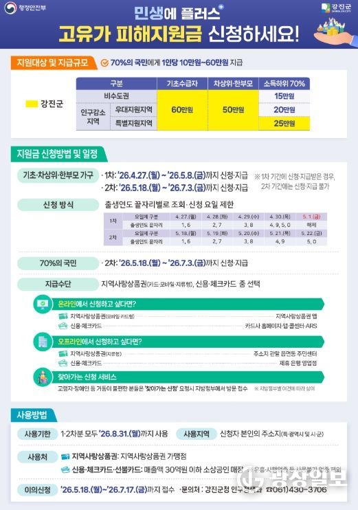 지역사랑상품권은 강진군 내 가맹점에서 사용할 수 있고, 신용·체크카드는 연매출 30억원 이하 소상공인업체 등에서 가능하다. 사용기한은 2026년 8월 31일까지이며, 기한 내 사용하지 못 할 경우 지원금은 소멸한다.