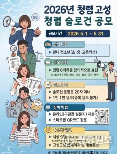 광장일보 주재영 기자 | 고성군은 관내 초·중·고등학생을 대상으로 「2026년 고성군 청렴 슬로건 공모전」을 오는 5월 말까지 실시한다.