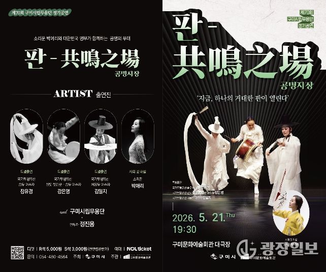 광장일보 주재영 기자 | 구미시는 5월 21일 오후 7시 30분, 구미시문화예술회관 대공연장에서 ‘제70회 구미시립무용단 정기공연 '판-共鳴之場공명지장'’을 개최한다.