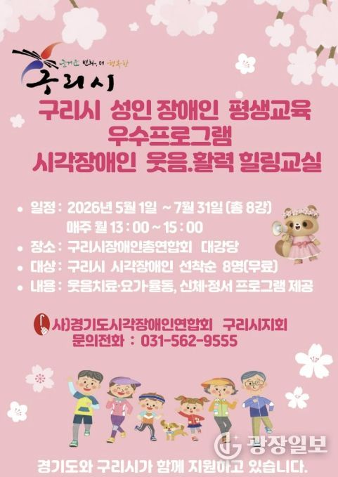 광장일보 주재영 기자 | 사단법인 경기도시각장애인연합회 구리시지회는 구리시와 경기도의 지원을 받아 2026년 5월부터 ‘시각장애인 웃음·활력 힐링 교실’을 운영할 예정이라고 밝혔다.