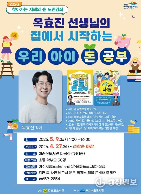 광장일보 주재영 기자 | 여수시립도서관은 5월 9일 토요일 오후 2시 이순신도서관 다목적강당에서 ‘찾아가는 지혜의 숲 도민강좌’를 개최한다.