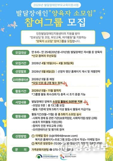 광장일보 주재영 기자 | 인천시사회서비스원 소속 인천장애인종합복지관은 ‘발달장애인 양육자 소모임’ 참여자를 모집한다고 21일 밝혔다.