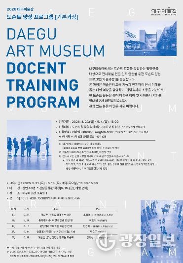 광장일보 주재영 기자 | 대구문화예술진흥원 대구미술관은 도슨트 활동을 희망하는 25세 이상 일반인을 대상으로 전시 해설 전문 인력 양성을 위한 ‘도슨트 양성 프로그램(기본과정)’을 운영하고, 2026년 교육생을 모집한다.