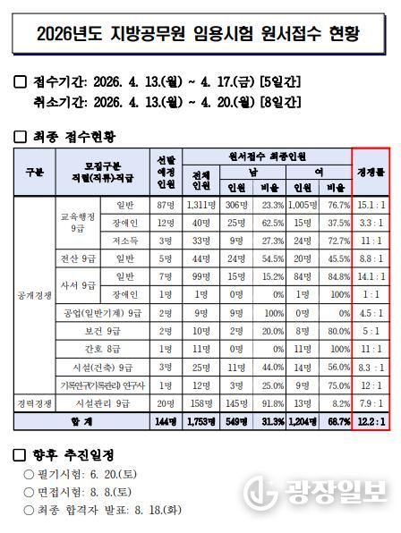 광장일보 주재영 기자 | 부산광역시교육청은 지난 13일부터 17일까지 실시한 ‘2026년도 지방공무원 임용시험’ 원서접수 결과 144명 선발에 1,753명이 지원해 평균 12.2대 1의 경쟁률을 보였다고 밝혔다.
