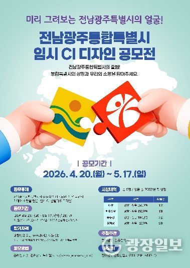 광장일보 주재영 기자 | 전라남도와 광주광역시는 통합특별시의 상징성을 나타내는 전남광주통합특별시 임시 CI 디자인을 5월 17일까지 28일간 전국민을 대상으로 공모한다고 밝혔다.