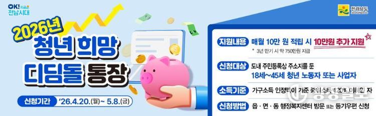 윤연화 전남도 인구청년이민국장은 “청년 희망디딤돌 통장은 일하는 청년이 안정적으로 목돈을 마련하도록 돕는 대표적 자산형성 정책”이라며 “앞으로도 청년의 지역 정착과 자립을 지원하는 맞춤형 정책을 지속해서 확대하겠다”고 말했다.