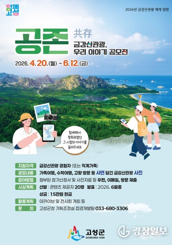 광장일보 이현나 기자 | 평화 경제 거점 도시 강원 고성군은 금강산관광의 사회적 가치와 국민의 소중한 기억을 재조명하고, 고성 평화경제특구 지정에 대한 공감대를 확산하기 위해 '공존(共存): 금강산관광, 우리 이야기' 공모전을 개최한다고 밝혔다.