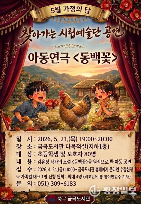 광장일보 주재영 기자 | 부산 북구는 오는 5월 21일 저녁 7시, 5월 가정의 달을 맞아 금곡도서관에서 지역 주민을 대상으로 김유정 작가의 단편소설 ‘동백꽃’을 원작으로 한 아동연극 공연을 개최한다고 밝혔다.