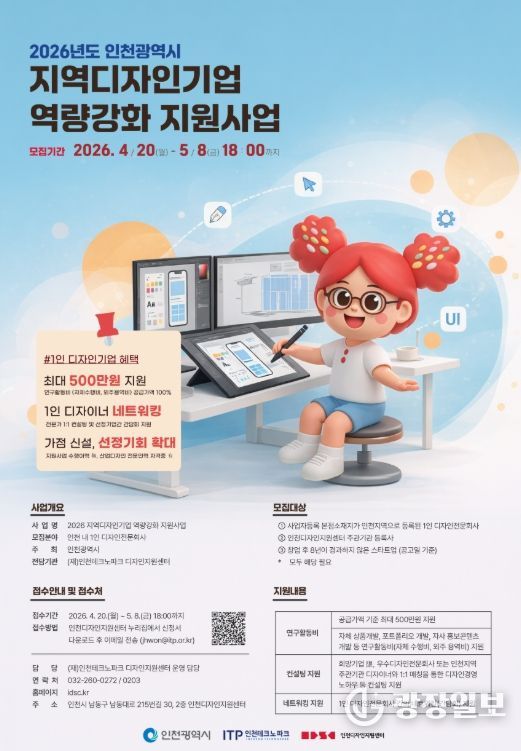 광장일보 주재영 기자 | 인천테크노파크(인천TP)는 오는 5월 8일까지 지역 디자인 산업의 경쟁력 강화를 위한 ‘2026 지역디자인기업 역량강화 지원사업’에 참여할 1인 디자인기업을 모집한다고 밝혔다.