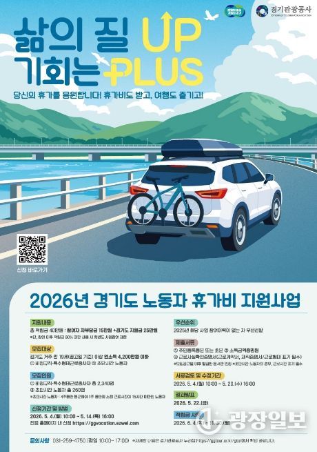 광장일보 주재영 기자 | 경기도가 경제적 부담으로 휴식을 포기했던 비정규직과 특수형태근로종사자에게 휴가비를 지원하는 ‘취약노동자 휴가비 지원사업’ 참여자를 5월 4일부터 14일까지 모집한다.