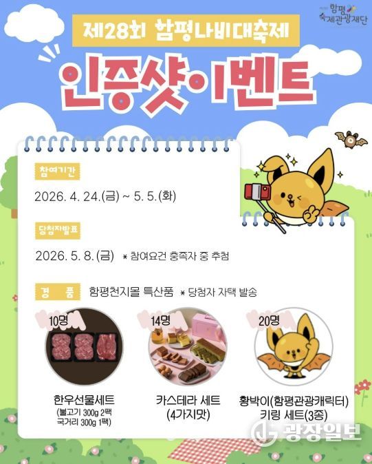 이벤트는 축제 개막일인 오는 24일부터 5월 5일까지 축제 기간 진행하며, 추첨을 통해 총 44명에게 경품을 제공한다. 경품으로는 함평천지몰 상품과 함평 관광 캐릭터 ‘황박이’ 열쇠고리 등이 준비돼 있다.