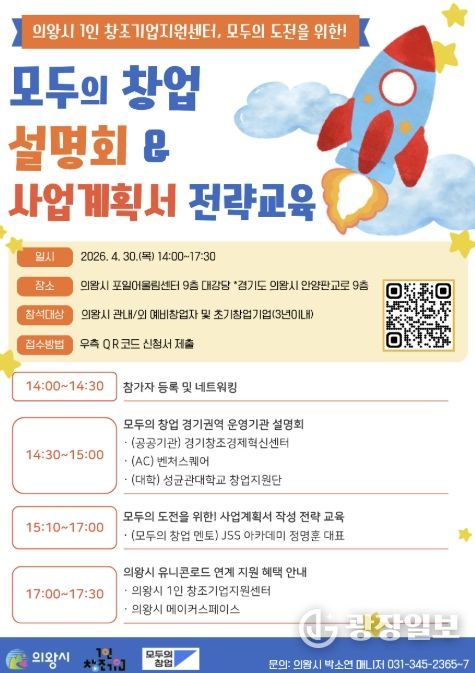 광장일보 주재영 기자 | 의왕시 1인 창조기업지원센터는 4월 30일, 창업을 희망하는 예비 및 초기 창업자를 대상으로 ‘모두의 창업’ 설명회 및 전략 교육을 개최한다.