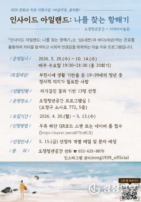 광장일보 주재영 기자 | 부천시는 오정청년공간에서 정서적 고립감을 겪는 청년을 위한 미술 치유 프로그램 ‘인사이드 아일랜드: 나를 찾는 항해기’ 참여자를 5월 13일까지 모집한다.