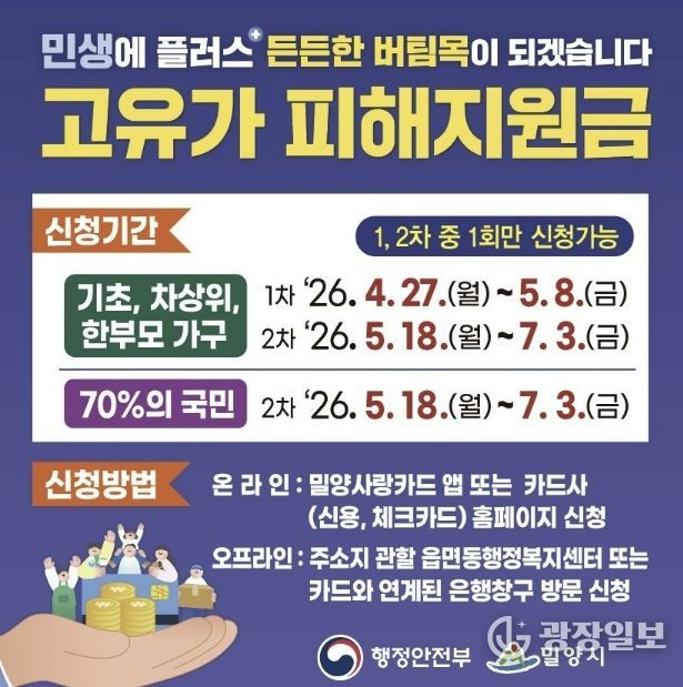 광장일보 주재영 기자 | 경남 밀양시는 고유가로 인한 시민 부담 완화를 위해 4월 27일부터 7월 3일까지 ‘고유가 피해지원금’ 신청을 접수한다.