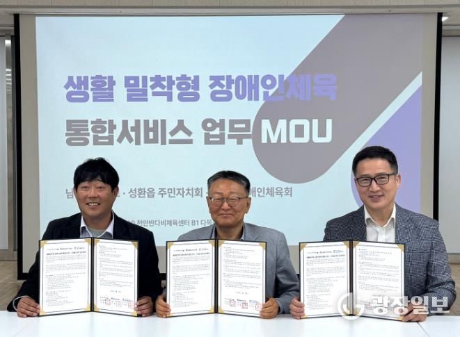광장일보 나학천 기자 | 천안시장애인체육회는 22일 천안반다비체육센터에서 성환읍 주민자치회, 남서울대학교와 ‘생활밀착형 장애인체육 통합서비스 구축을 위한 업무협약’을 체결했다.