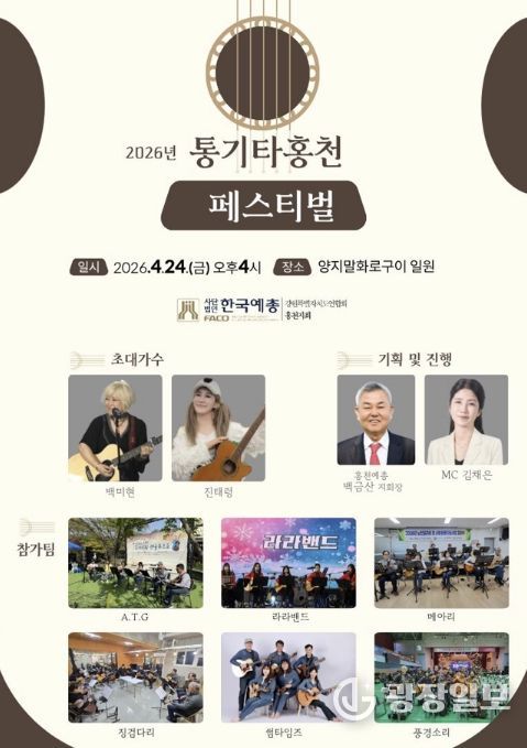 광장일보 이현나 기자 | (사)한국예총 홍천지회가 주관하는 2026 통기타 홍천 페스티벌이 오는 4월 24일 오후 4시 홍천 양지말화로구이 일원에서 열린다.