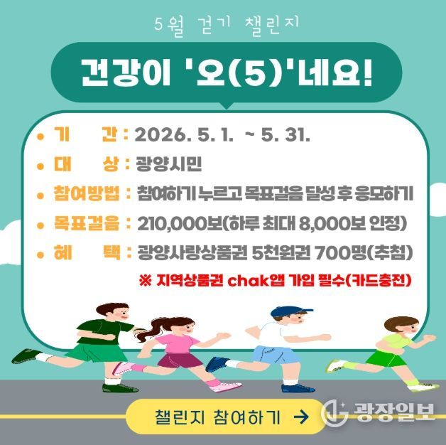 광양시 관계자는 “걷기는 일상에서 쉽게 실천할 수 있는 건강 습관”이라며 “이번 챌린지를 통해 시민들이 걷기의 즐거움을 느끼고 건강한 생활을 이어가길 바란다”고 말했다.