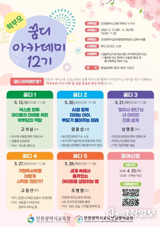 광장일보 주재영 기자 | 인천광역시교육청평생학습관은 23일부터 인천 관내 학부모를 대상으로 ‘2026년 학부모 꿈디 아카데미 12기’ 학습자를 모집한다.