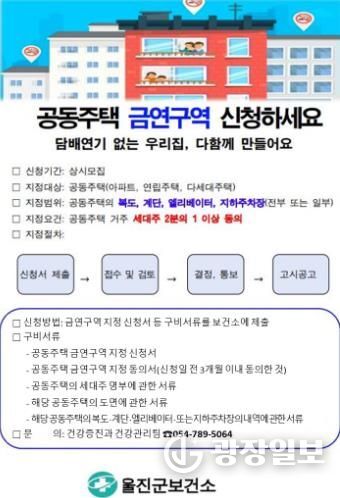 광장일보 주재영 기자 | 울진군은 금연환경 조성 및 쾌적한 주거환경 조성을 위해 관내 공동주택을 대상으로‘공동주택 금연구역 지정’을 연중 신청받는다.
