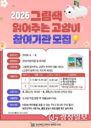 광장일보 주재영 기자 | 경상북도교육청 봉화도서관(관장 이영숙)은 오는 5월부터 8월 까지 관내 어린이집과 유치원을 대상으로 디지털 독서 콘텐츠 '그림책 읽어주는 고양이'프로그램 참여기관을 선착순으로모집한다.
