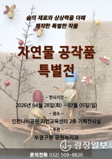 광장일보 주재영 기자 | 부평구는 부평숲 인천나비공원에서 오는 28일부터 ‘자연물 공작품 특별전’을 개최한다고 밝혔다.