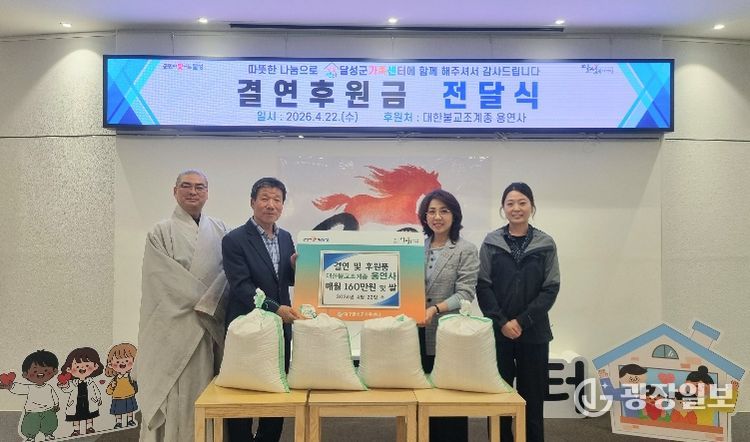 광장일보 주재영 기자 | 달성군가족센터(센터장 방승희)는 지난 22일 센터 내에서 대한불교조계종 용연사(주지 능도 스님)와 함께 ‘취약·위기 다문화가정 결연금 전달식’을 가졌다고 밝혔다. 이번 사업은 경제적 고통과 위기 상황에 놓인 관내 저소득 다문화 8가구를 돕기 위해 기획됐다.