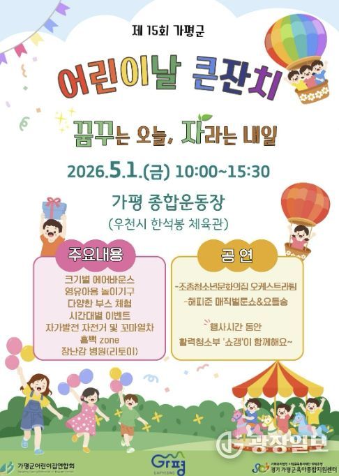 광장일보 주재영 기자 | 가평군은 오는 5월 1일 오전 10시 가평종합운동장에서 ‘제15회 가평군 어린이날 기념행사’를 개최한다. 가평군어린이집연합회와 가평군육아종합지원센터가 공동 주관하는 이번 축제는 기념행사와 공연, 놀이, 체험 부스 등 다채로운 프로그램으로 꾸며진다.