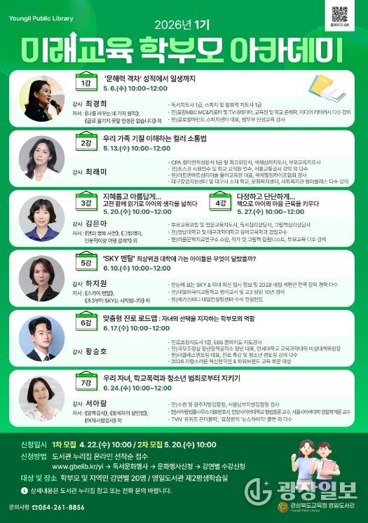 광장일보 주재영 기자 | 경상북도교육청 영일도서관은 오는 5월 6일부터 학부모 및 지역주민을 대상으로 ‘2026 1기 미래교육 학부모 아카데미’를 운영하고 수강생을 모집한다.