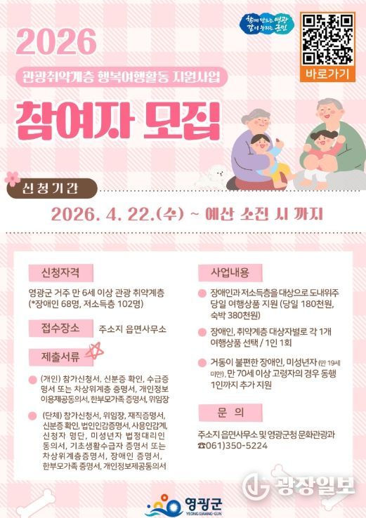 광장일보 주재영 기자 | 영광군은 지난 4월 22일부터 관광활동에서 소외되기 쉬운 관광취약계층의 기본권 보장을 위해‘2026년 관광 취약계층 행복여행활동 지원사업’참가자를 모집하고 있다고 밝혔다.