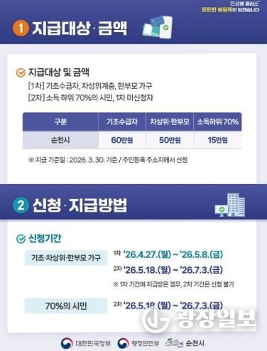 광장일보 주재영 기자 | 순천시는 중동발 고유가로 인한 시민 부담 완화와 지역 경제를 살리기 위해 자체적으로 지급 중인 ‘순천시 민생회복지원금’에 이어, 오는 27일부터 정부 정책에 따른 1차 ‘고유가 피해지원금’을 지급한다.