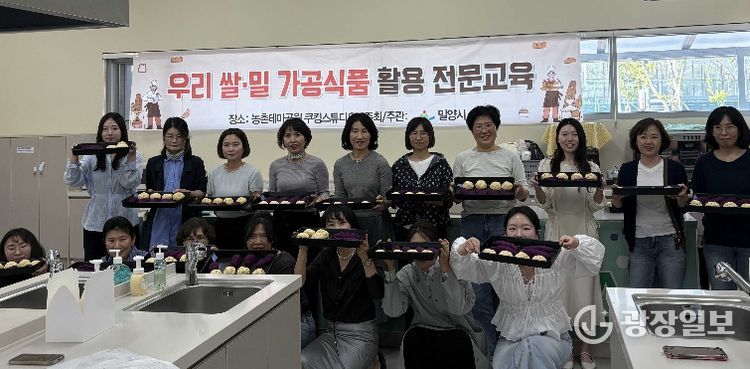 광장일보 주재영 기자 | 경남 밀양시는 지난 21일과 23일 이틀간 선샤인 밀양 테마파크에서 우리 쌀·밀의 소비 확대와 건강한 식문화 정착을 위해 관내 학교 초·중·고등학교 영양교사 37명을 대상으로 ‘우리 쌀·밀 가공식품 활용 전문교육’을 실시했다.