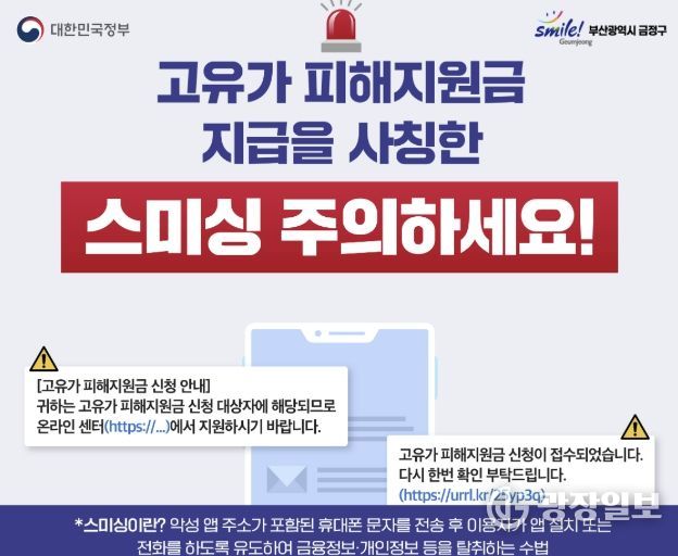 광장일보 주재영 기자 | 부산 금정구는 오는 4월 27일부터 ‘고유가 피해지원금’ 지급이 시작됨에 따라 이를 사칭한 스미싱(문자 결제 사기) 피해 예방을 위해 구민들에게 각별한 주의를 당부한다고 23일 밝혔다.