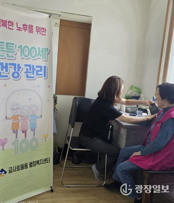 ‘튼튼100세’ 사업은 금사회동동 복지팀 간호직 공무원이 건강관리를 희망하는 경로당을 차례대로 방문해 △혈압·혈당 측정 등 기초 건강검사 △건강 상담 △만성질환 예방 관리 교육을 제공하는 사업이다.