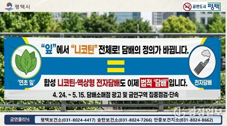 광장일보= 주재영 기자 | 평택시는 24일부터 개정된 『담배사업법』에 따라 신종 전자담배를 포함한 모든 니코틴 제품에 대한 집중 점검과 홍보를 실시한다.