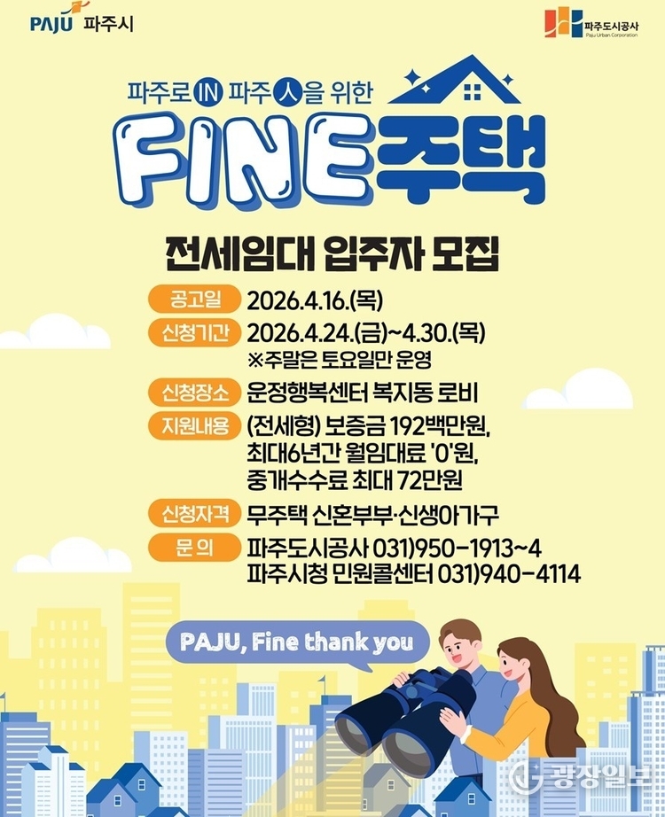광장일보 =주재영 기자 | 파주시는 신혼부부와 신생아 가구의 주거비 부담을 줄이기 위해 '파인(FINE)주택' 전세임대 입주자 모집을 시작한다.
